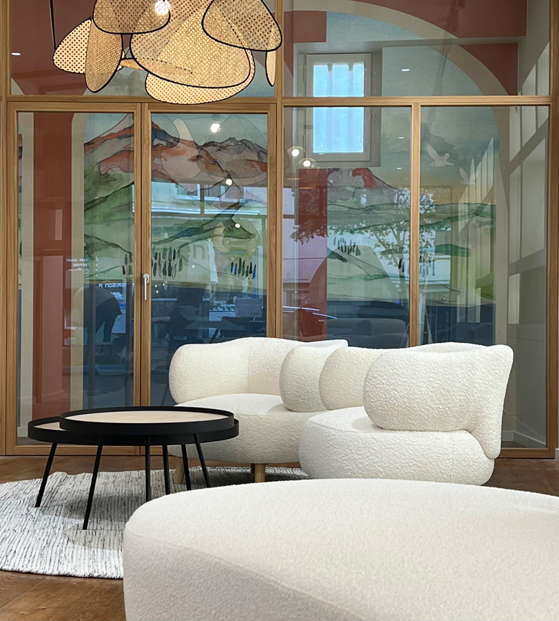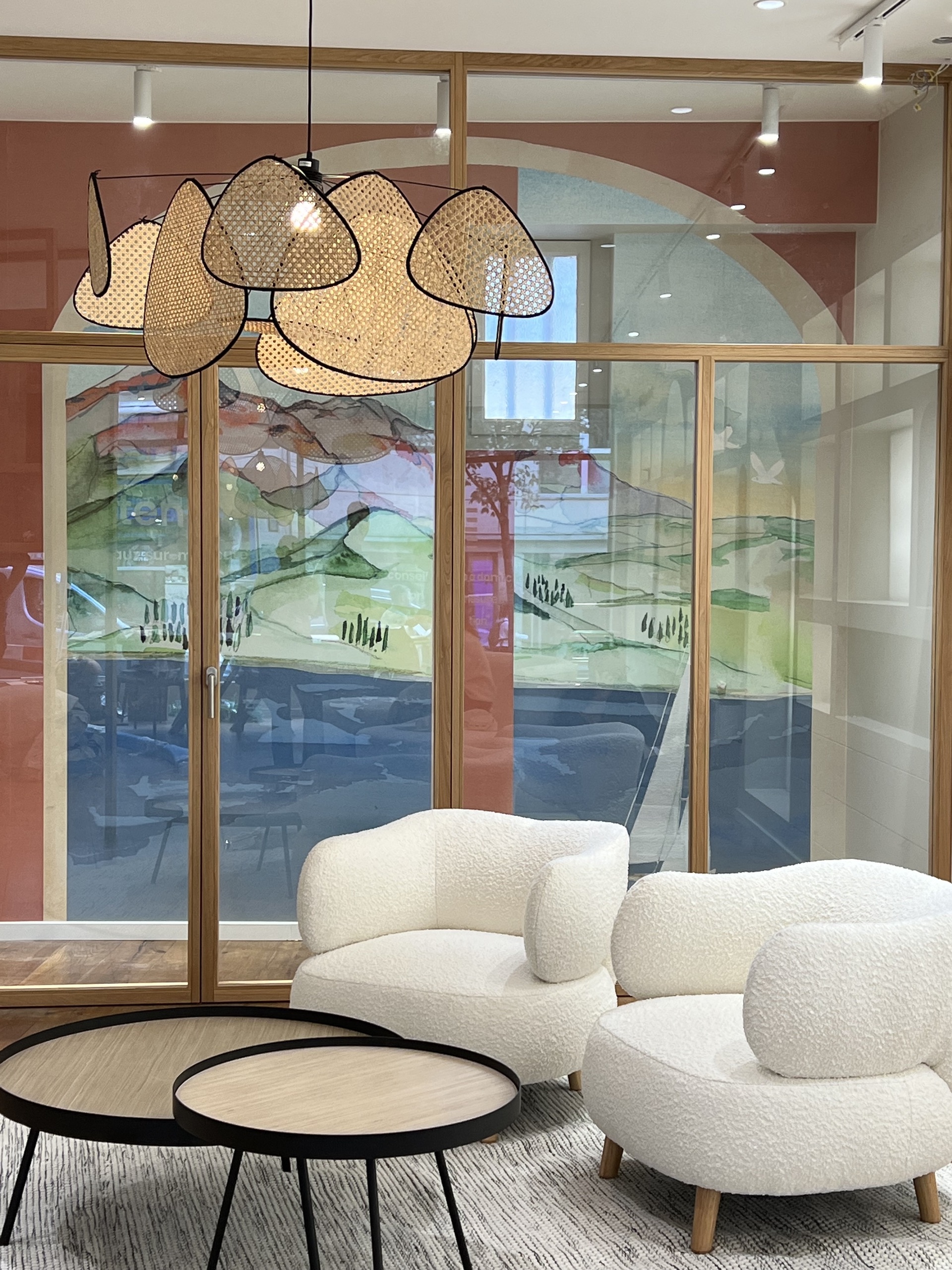 As is customary for us, we had the pleasure of collaborating with artists to create a truly unique decor. Pamina from Kariokas crafted a magnificent mural depicting a landscape from Vaud, featuring a view of the lake and mountains through a perspective of arches.